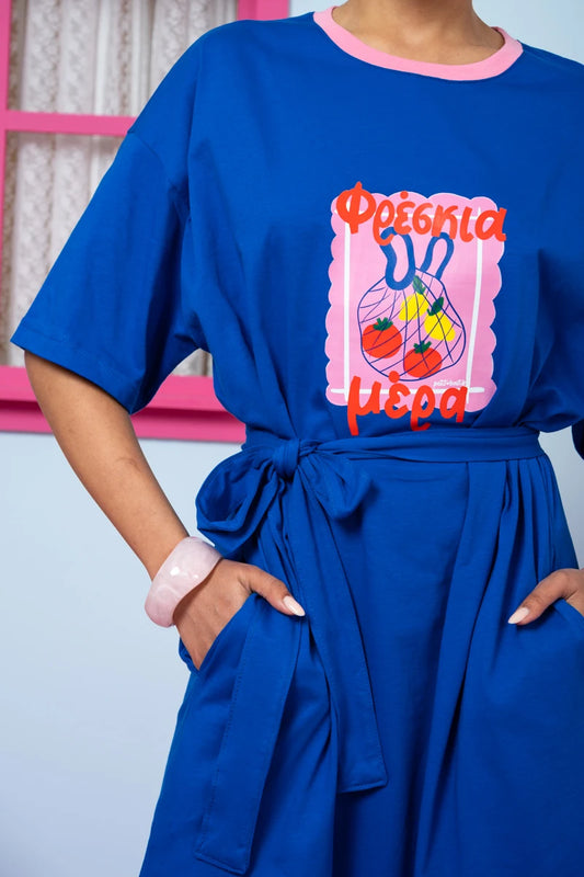 Reina T-shirt Dress “Φρέσκια Μέρα” Μπλε Κοντομάνικο Φόρεμα με Τσέπες & Ζώνη Petit Boutik