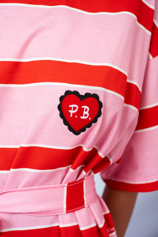 Reina T-shirt Dress Red Pink Stripes Με Κέντημα Καρδιά Κοντομάνικο Φόρεμα με Τσέπες & Ζώνη Petit Boutik