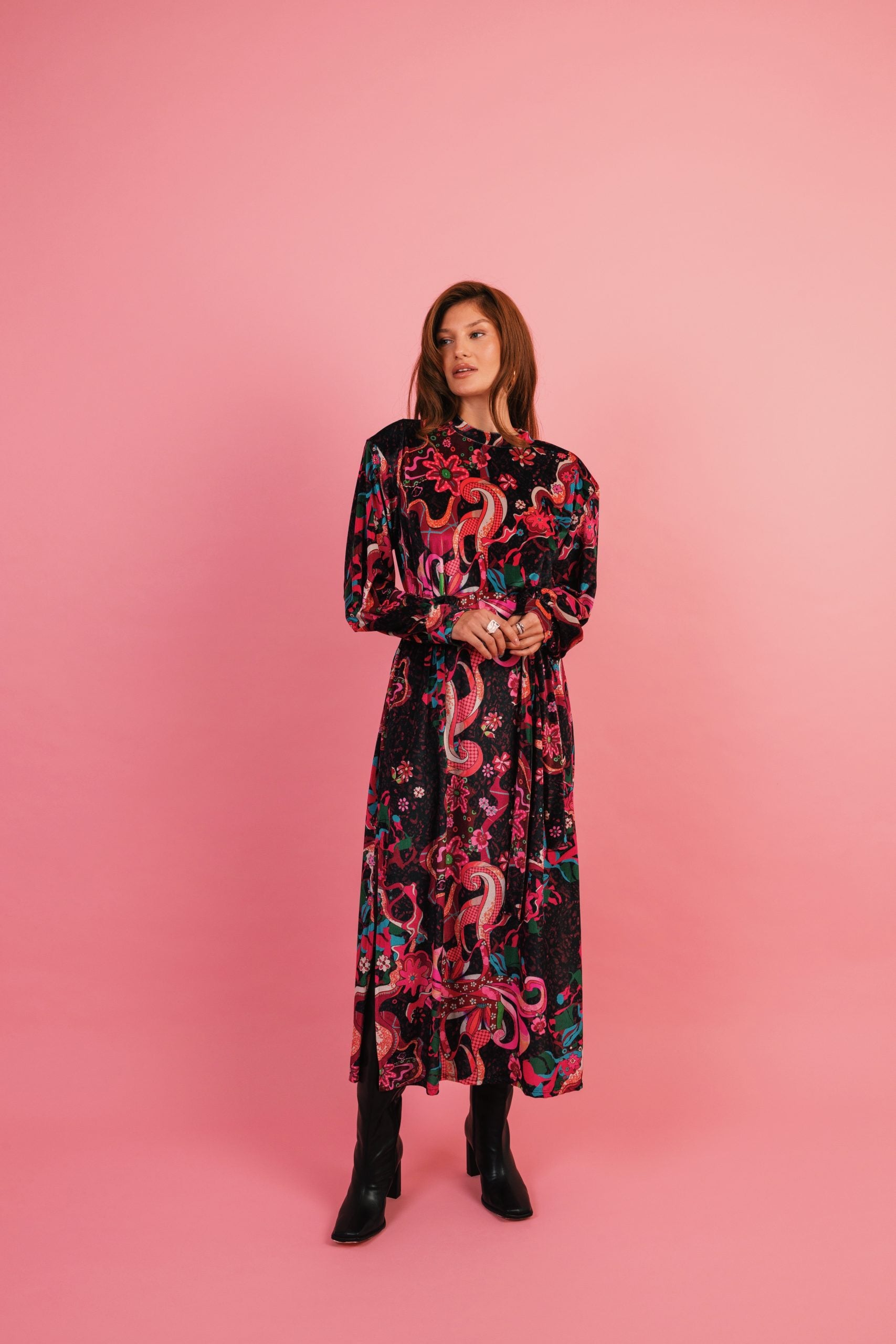 - Oversized maxi dress silhouette for relaxed elegance