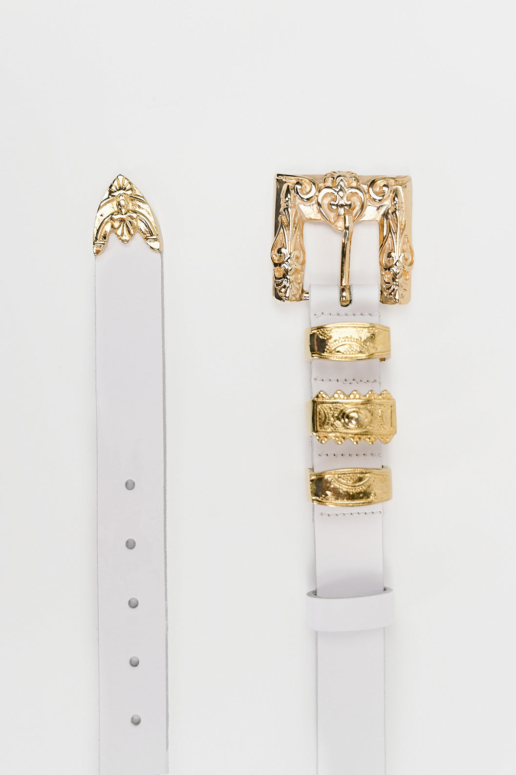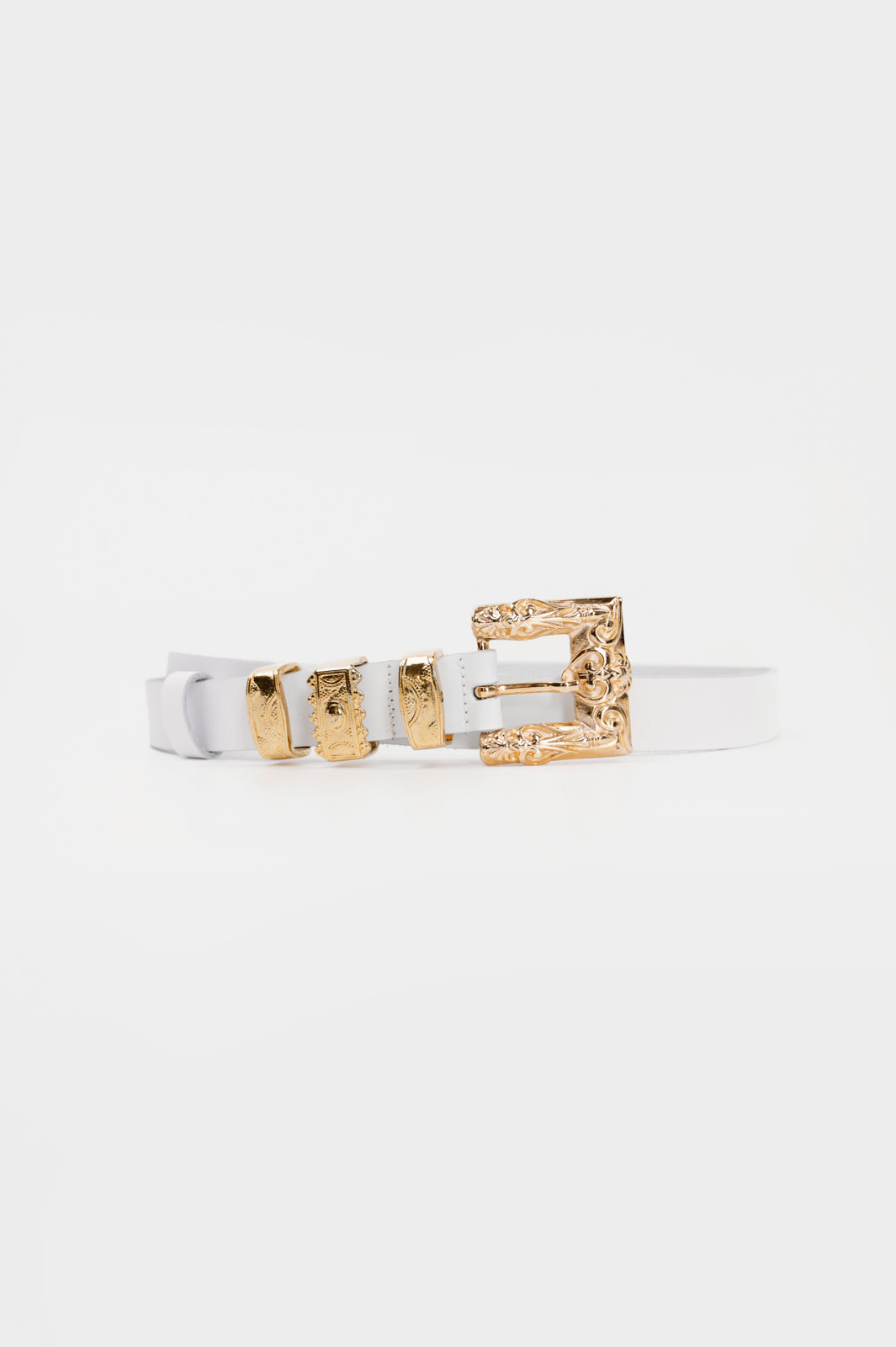 ΒΑΜΒΙ ΛΕΥΚΗ δερμάτινη λεπτή γυναικεία ζώνη με χρυσή σκαλιστή αγκράφα, τρεις υπέροχες διακοσμητικές θηλιές και μύτη . Το φάρδος της είναι 3 cm.Είναι μια λεπτή ζώνη δερμάτινη υψηλής αισθητικής που ταιριάζει στα θηλύκια όλων σχεδόν των παντελονιών. Είναι κατασκευασμένη από δέρμα Ιταλίας που έχει υποστεί την κατάλληλη επεξεργασία και έχει εξαιρετική αντοχή και μοναδική αίσθηση. Είναι εξαιρετικά ανθεκτική σε όλες τις συνθήκες.