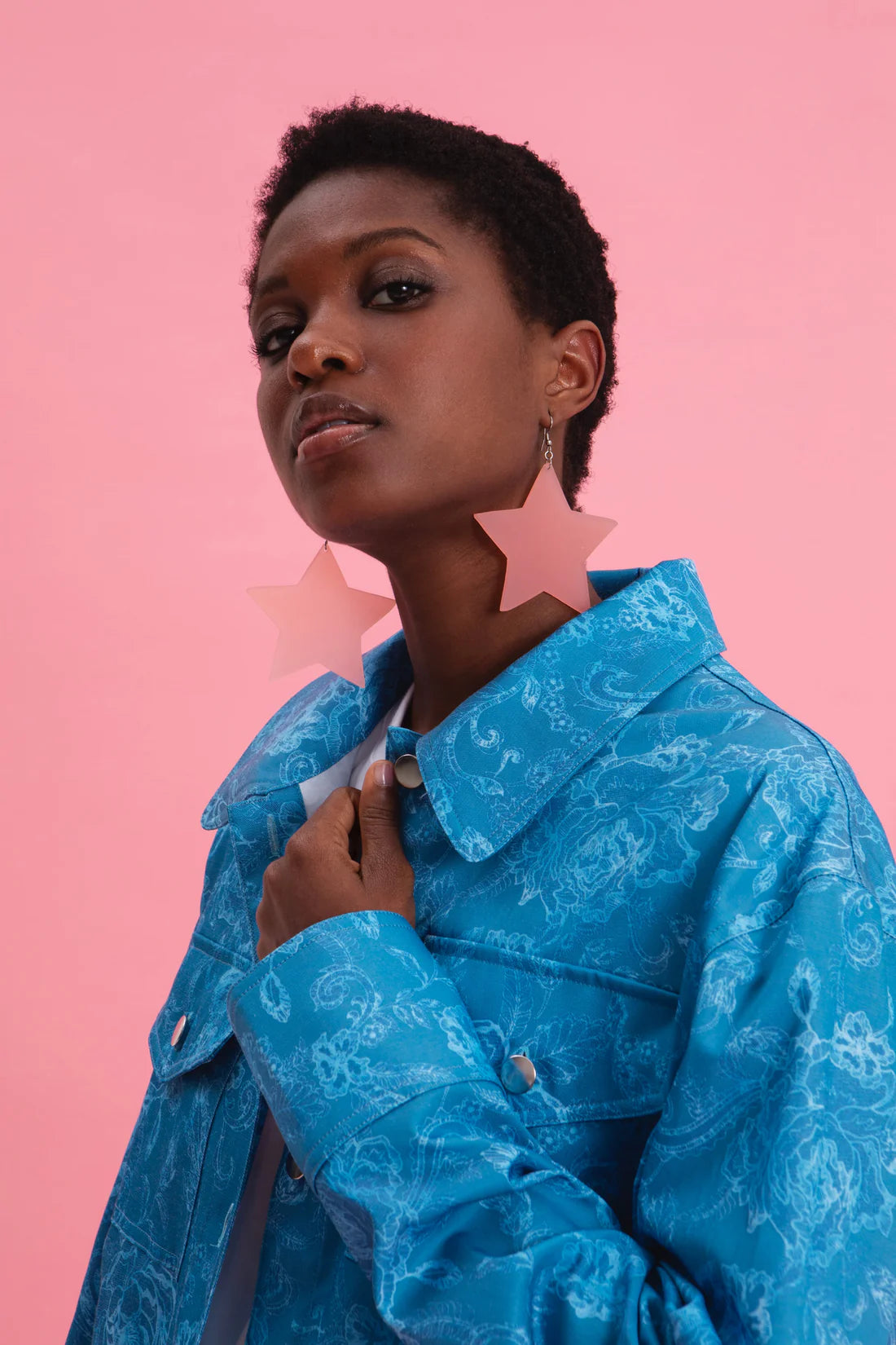 Αυτό το ντένιμ τζάκετ είναι μία statement επιλογή με μοναδικό χαρακτήρα και έντονη αισθητική. Κατασκευασμένο από βαμβακερό ντένιμ ύφασμα με ανάγλυφο φλοράλ μοτίβο σε τόνους του τιρκουάζ και του γαλάζιου, προσφέρει μια φρέσκια και μοντέρνα εκδοχή του κλασικού denim jacket. Διαθέτει κλασικό γιακά, κουμπιά σε μεταλλικό τόνο, δύο τσέπες στο στήθος με καπάκι και κουμπί, καθώς και μακρυά μανίκια με μανσέτες και κουμπιά. Η εφαρμογή είναι άνετη, με ίσια γραμμή που επιτρέπει layering, ενώ συνδυάζεται ιδανικά με το Aquatic Elegance cotton pants για ένα total look, ή φοριέται πάνω από απλό T-shirt και jeans για πιο casual σύνολα. Ένα κομμάτι που φέρνει 70s αύρα με σύγχρονο twist και χρώμα, ιδανικό για ξεχωριστές εμφανίσεις.