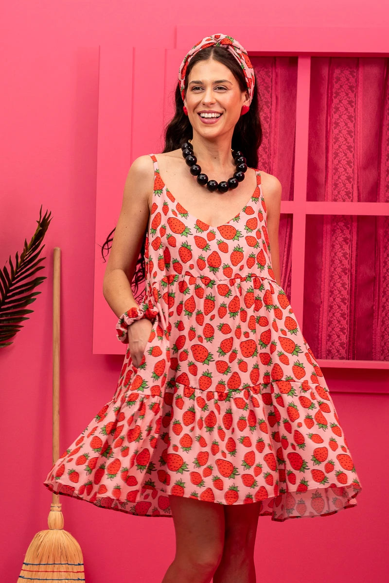 Beverly Short Dress Vis Pink Strawberries Τιραντέ Φόρεμα με Ζώνη & Τσέπες Petit Boutik