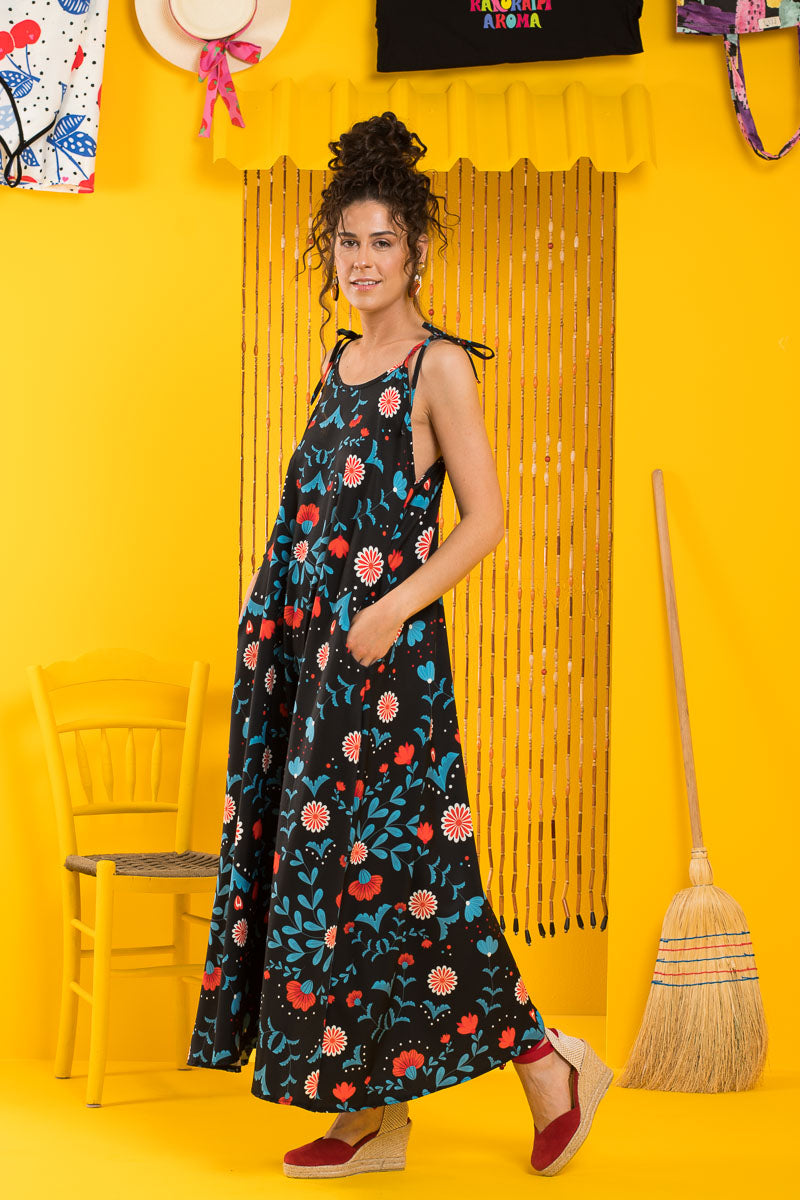 Γυναικείο μακρύ τιραντέ εξώπλατο φόρεμα Petit Boutik, με υπέροχο μοτίβο στο ύφασμα και τσέπες. Κολακεύει και ταιριάζει σε κάθε σωματότυπο καθώς έχει φαρδιά γραμμή στυλ Α με άνοιγμα στην πλάτη και λάστιχο. Οι τιράντες είναι δετές για να μπορείς να τις αυξομειώνεις στο ύψος που σε βολεύει. Φοριέται με άνεση όλες τις ώρες με τα κατάλληλα αξεσουάρ και κοσμήματα. Το ύφασμα δεν έχει ελαστικότητα και δεν διαφανίζει.