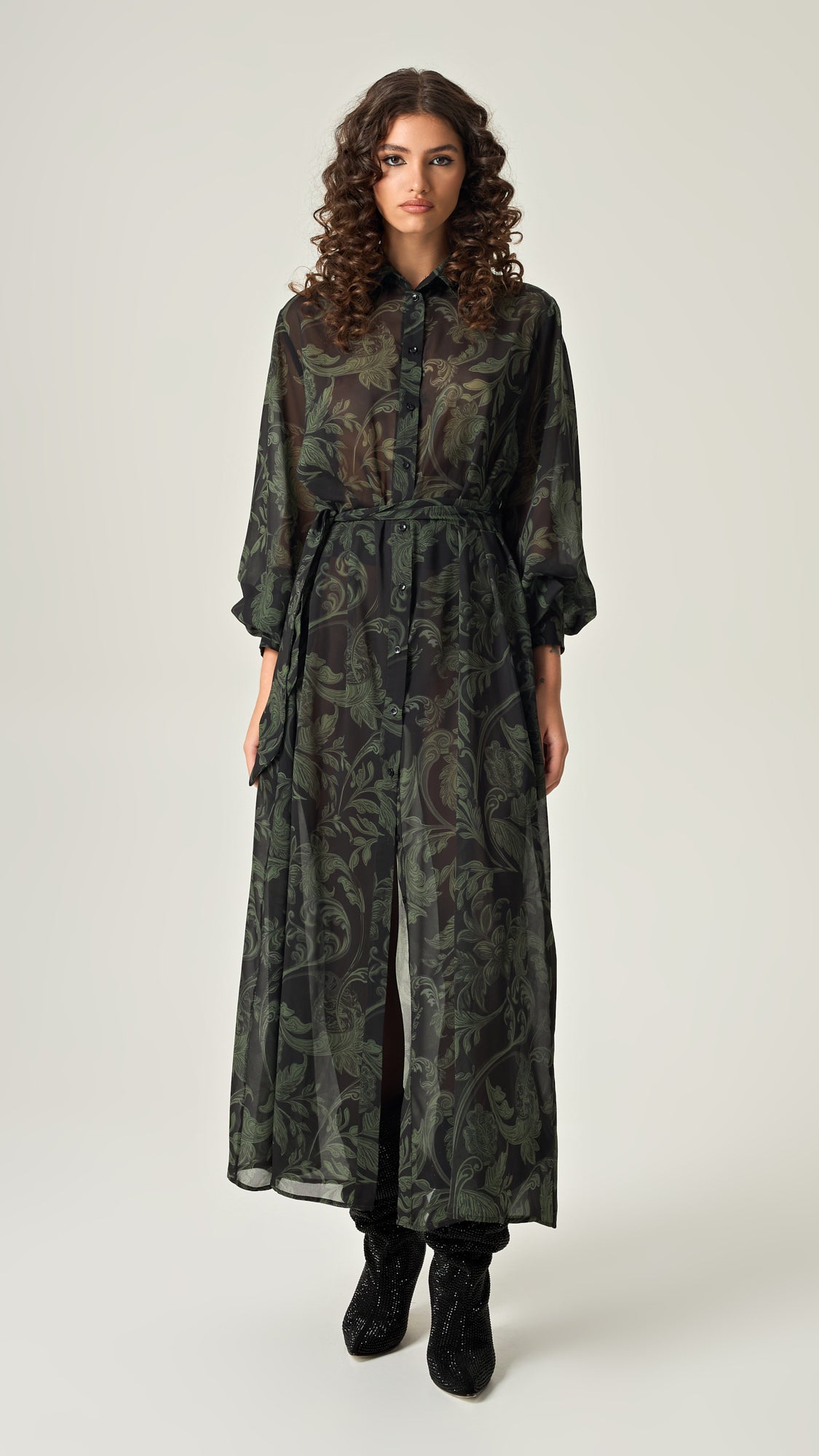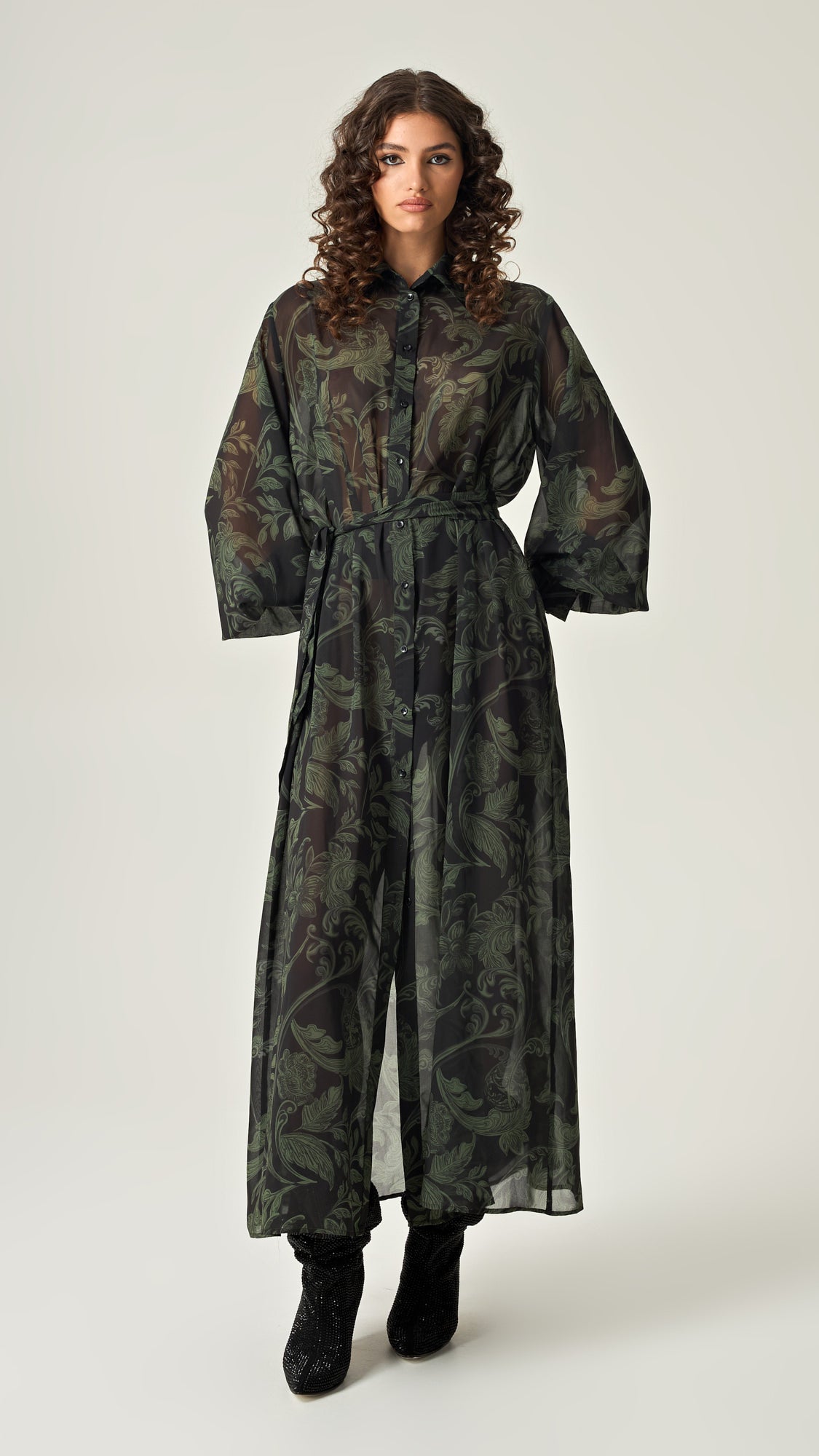 Το Emerald Shadows Shirtdress από τη συλλογή Eclipse of Elegance, συνδυάζει τη θηλυκή κομψότητα με τη δυναμική γραμμή ενός πουκαμίσου. Με το εκλεπτυσμένο σκούρο πράσινο μοτίβο του, αυτό το φόρεμα αγκαλιάζει το σώμα με μια αέρινη, χαλαρή εφαρμογή, προσδίδοντας μία αίσθηση πολυτέλειας και άνεσης. Ιδανικό για ημέρα και βραδινές εμφανίσεις, μπορεί να συνδυαστεί με statement αξεσουάρ ή να φορεθεί απλά για μια κομψή, minimal εμφάνιση.