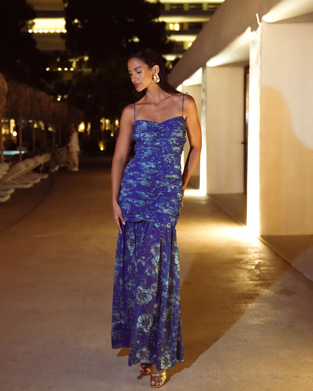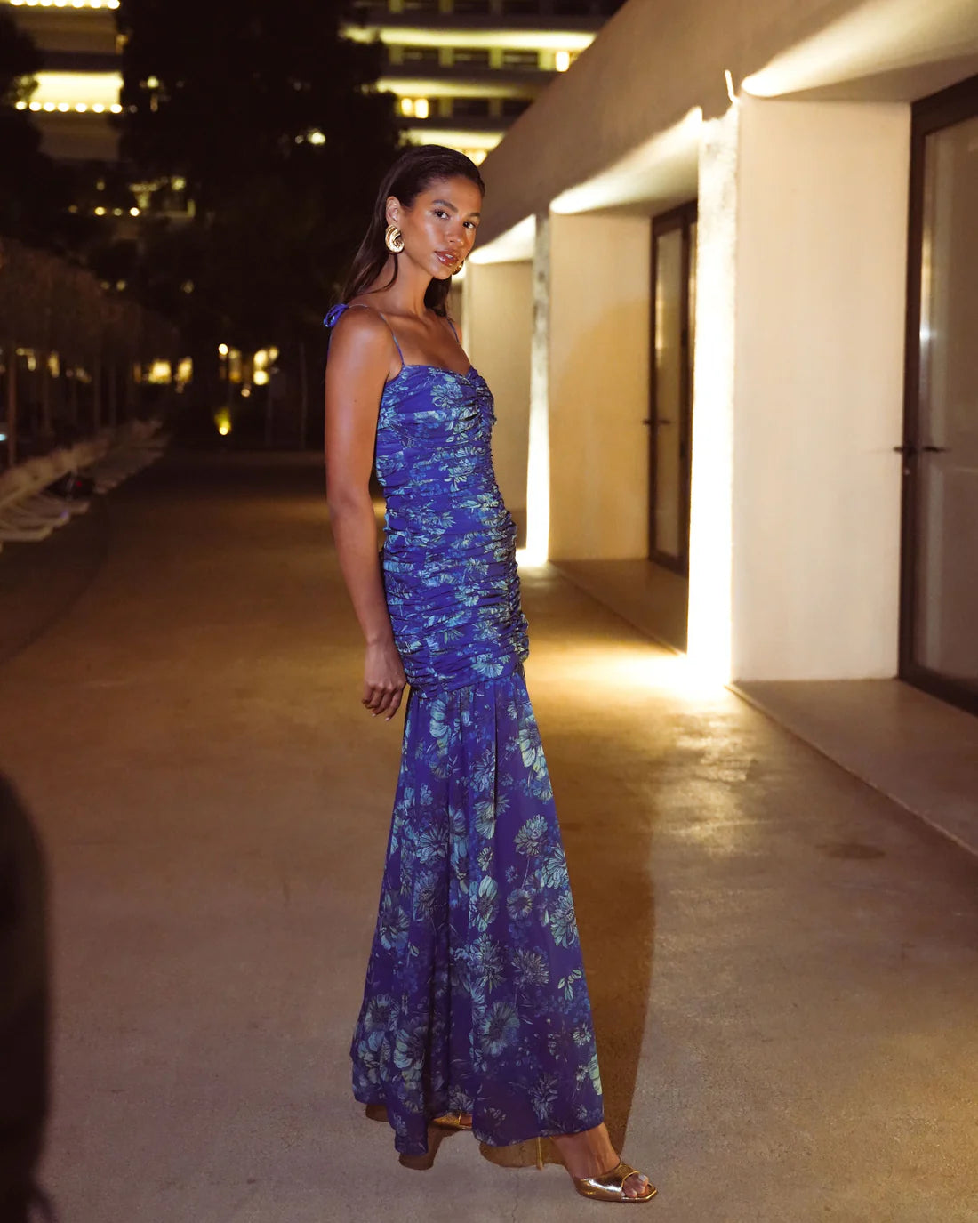 Οι λεπτές τιράντες δένουν στους ώμους προσδίδοντας μία διακριτικά girly πινελιά, ενώ η floral εκτύπωση σε αποχρώσεις του μπλε και του πράσινου, συνδυάζει την αρμονία της φύσης με μια φρέσκια, καλοκαιρινή αύρα. Είναι ιδανικό για επίσημες καλοκαιρινές εμφανίσεις, βραδινά events ή έναν ρομαντικό περίπατο στο νησί.