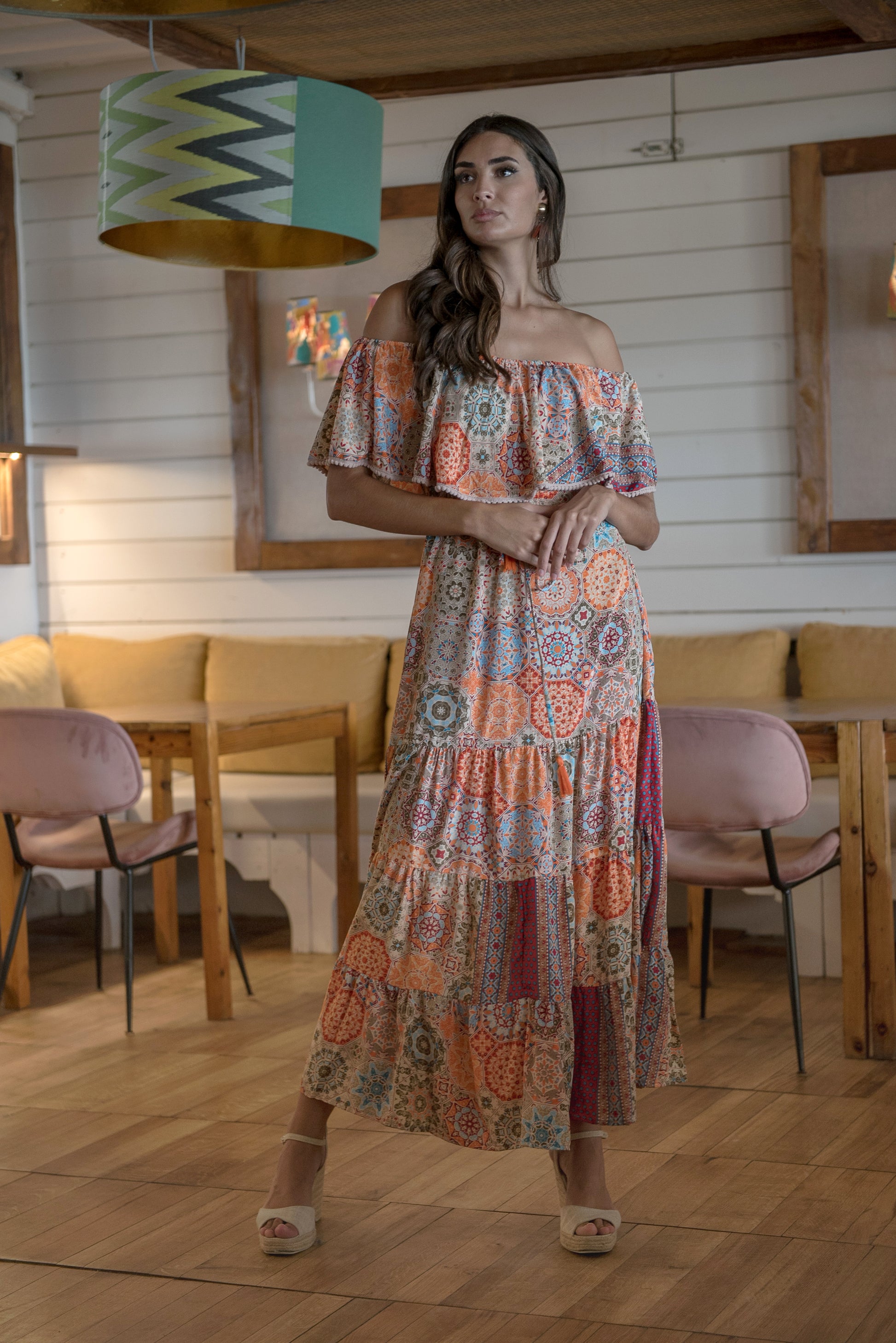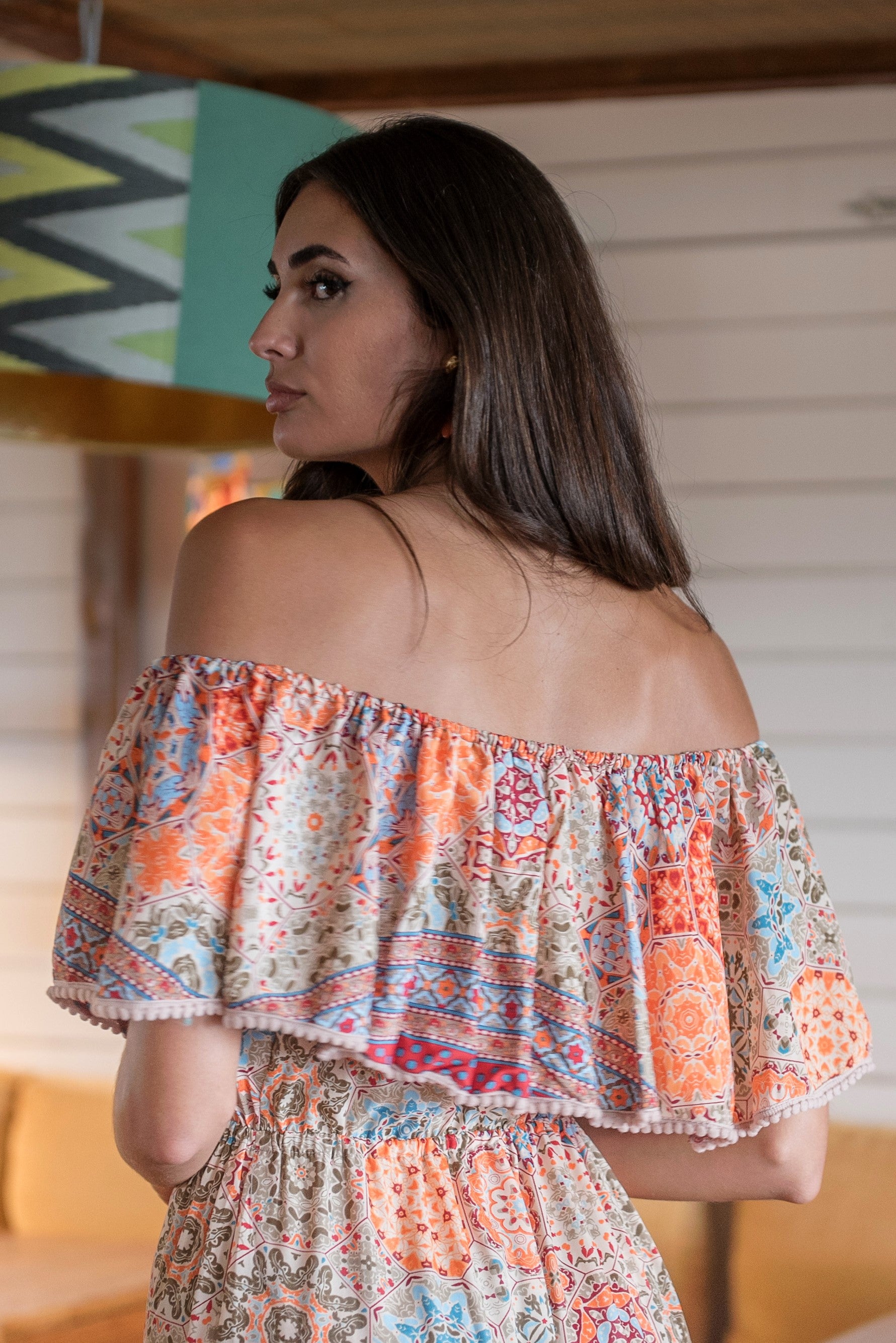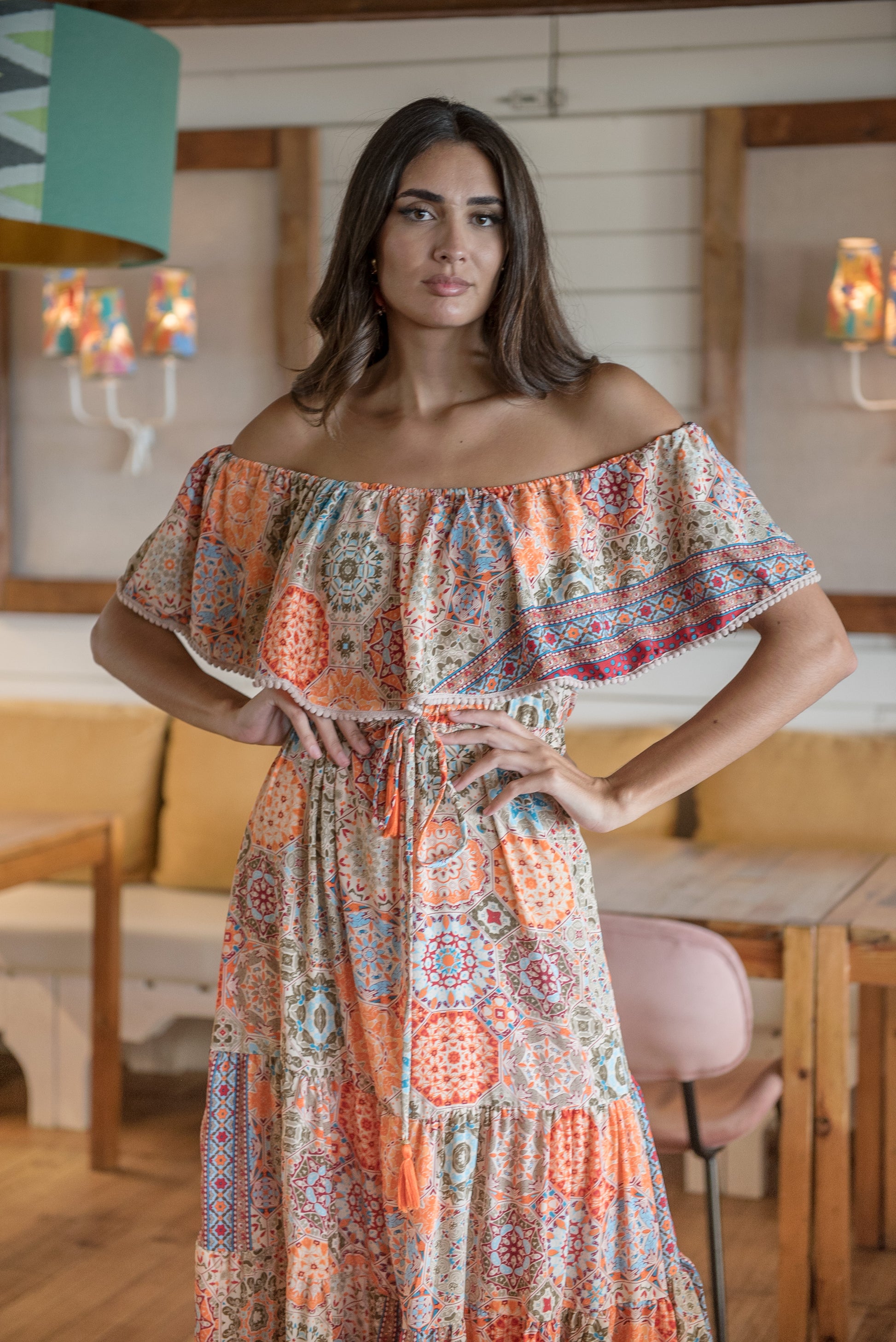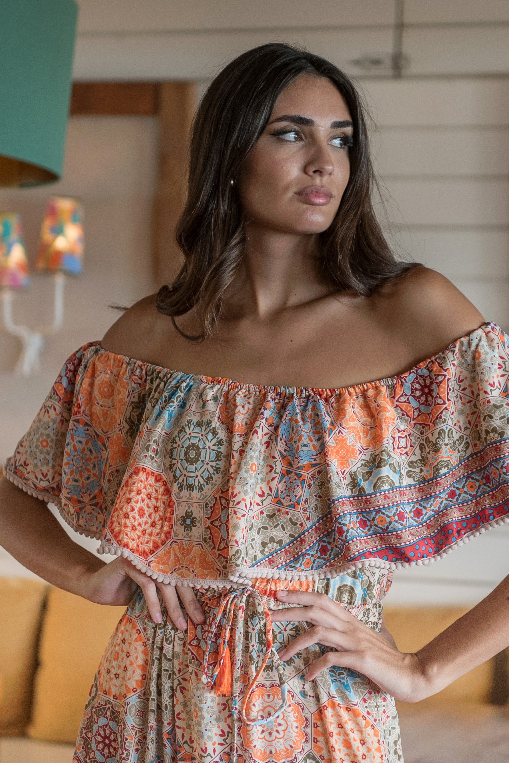 - Orange dream maxi φόρεμα με ελαφρύ βολάν & έξω τους ώμους