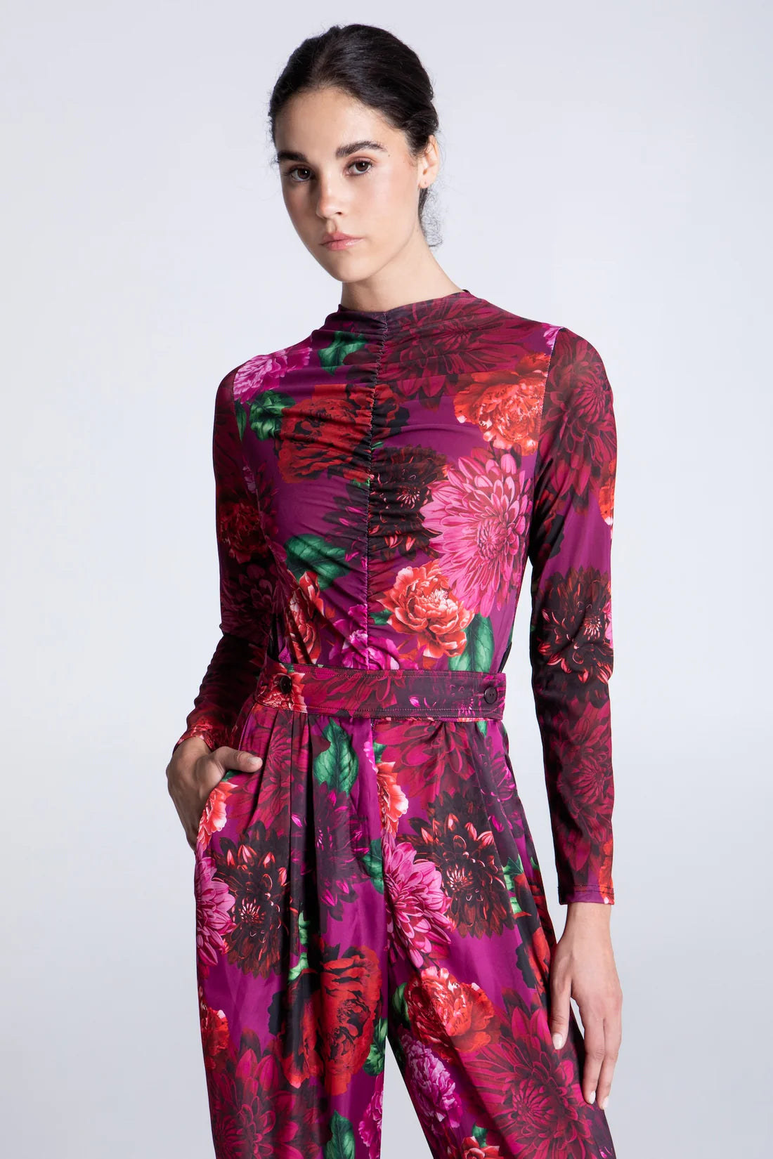 Κορμάκι από ελαστικό mesh ύφασμα με floral hand-panted μοτίβο.