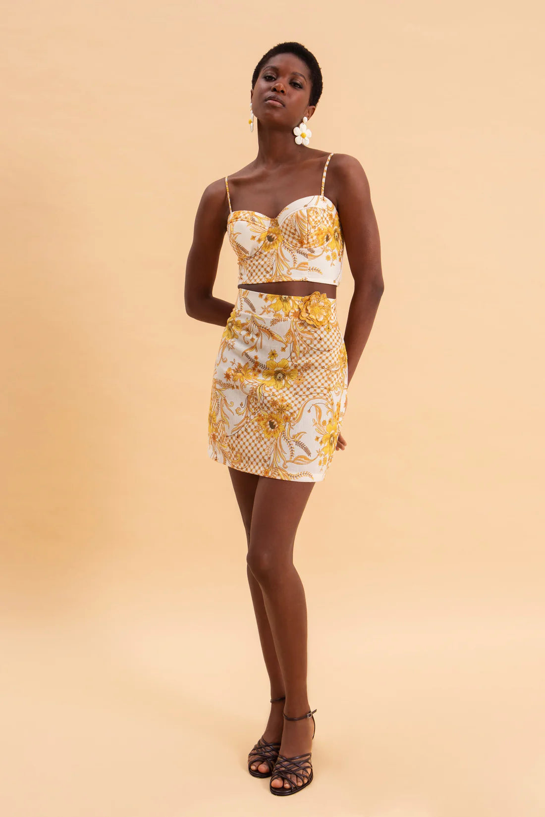 Το ύφασμα του είναι δροσερό λινό με φλοράλ εκτύπωση σε γήινους τόνους του λευκού και του χρυσοκίτρινου, με μοτίβα λουλουδιών και γεωμετρικά στοιχεία που το κάνουν να ξεχωρίζει. Ένα ιδανικό κομμάτι για καλοκαιρινές εμφανίσεις, που συνδυάζεται τέλεια με την Marigold mini linen skirt ή με το Marigold linen pants για ένα ολοκληρωμένο σετ.