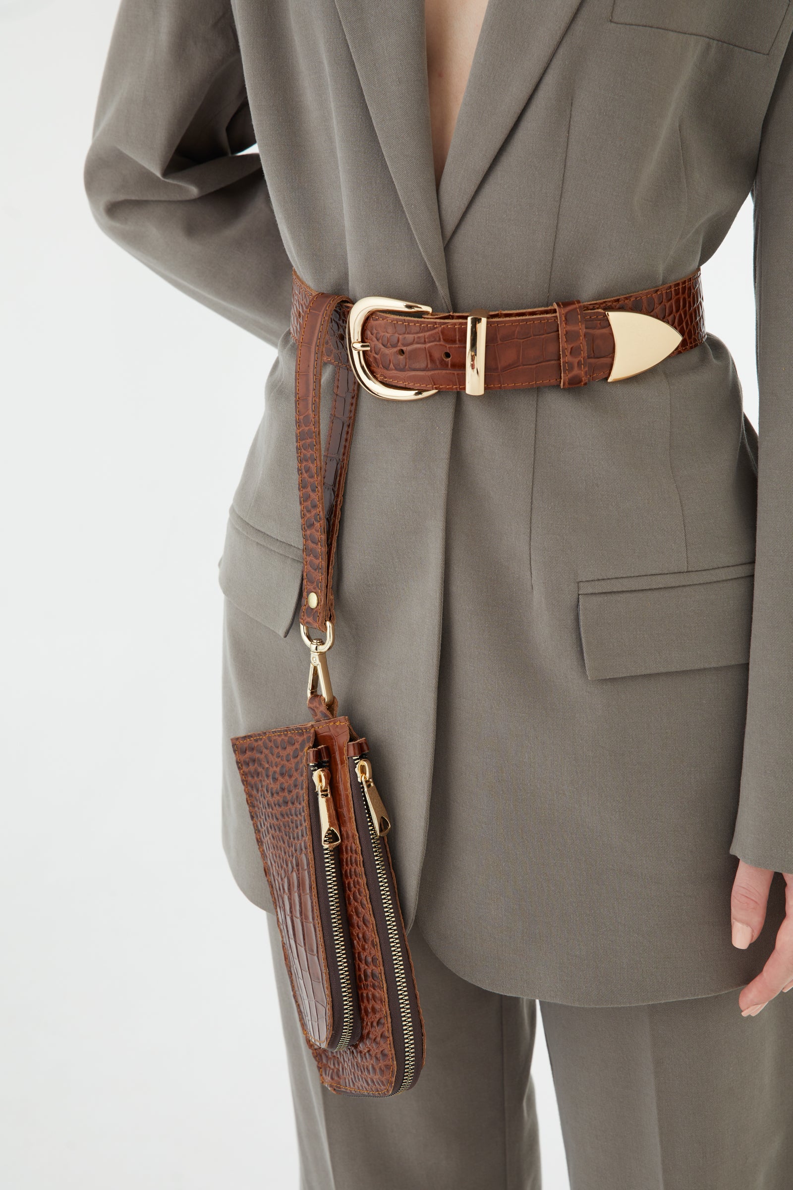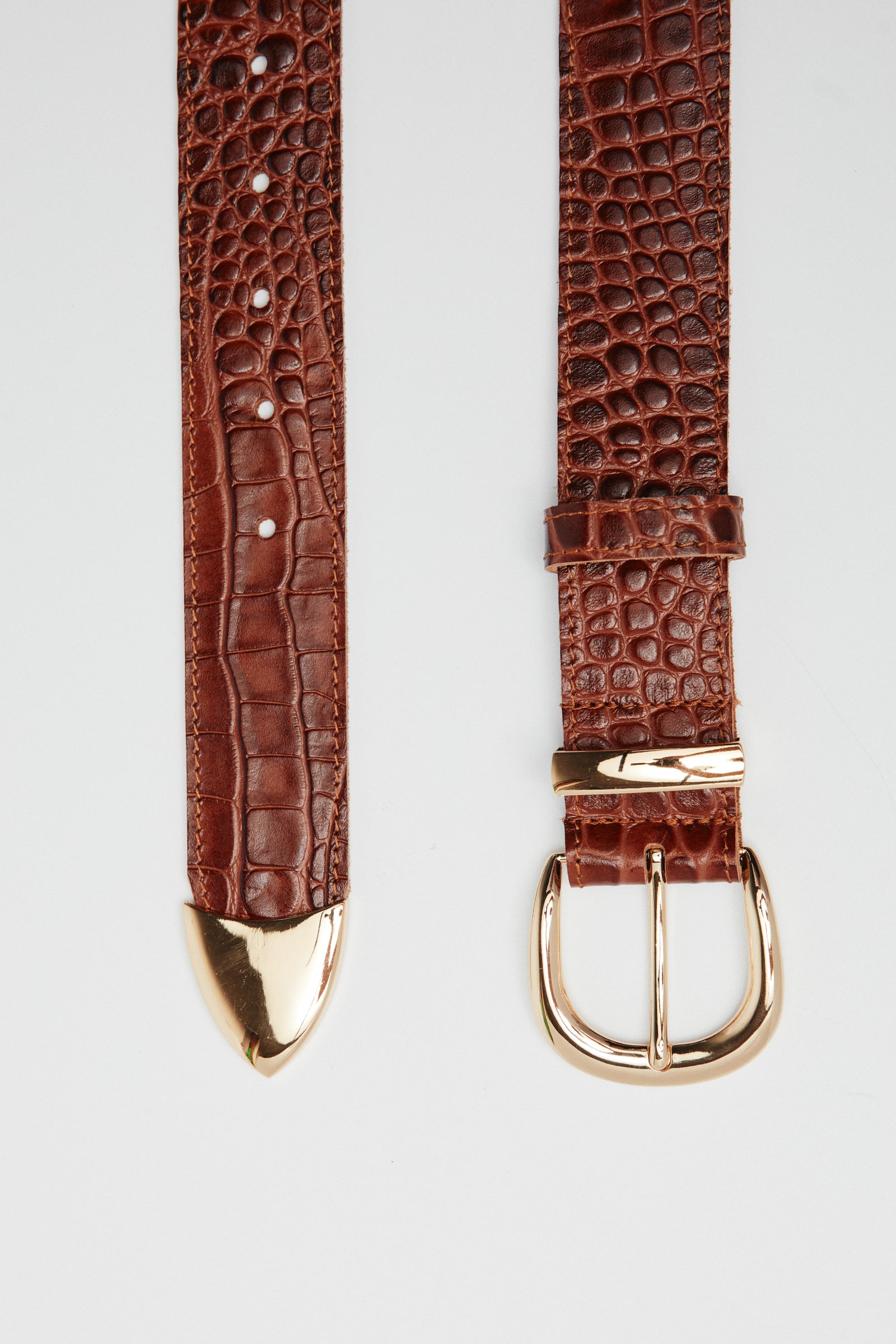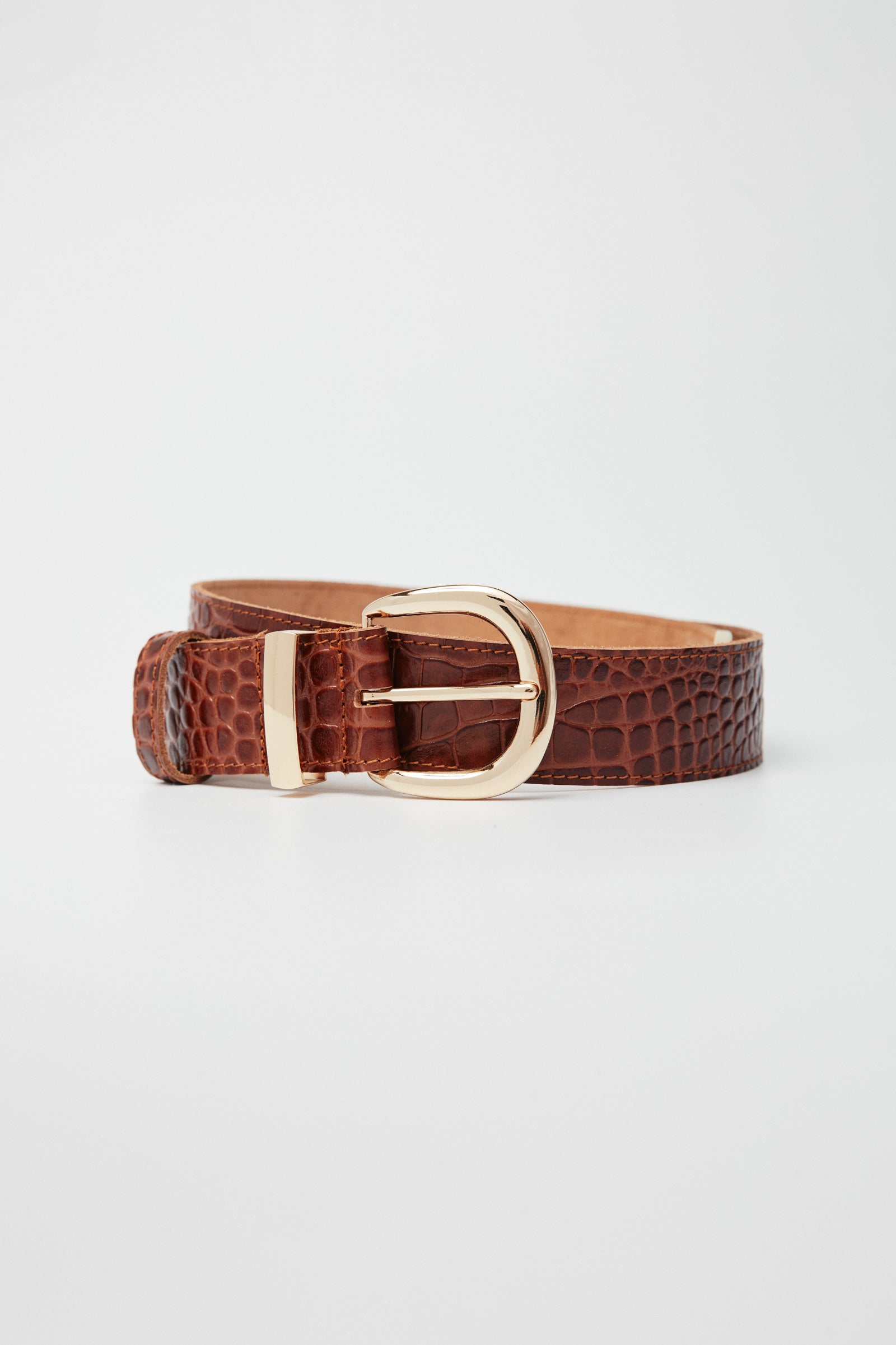 MIRANDA ΚΑΦΕ δερμάτινη κροκό ζώνη με χρυσή αγκράφα, θηλιά και μύτη. Το φάρδος της είναι 4 cm, ώστε να μπορεί να περαστεί από τα θηλύκια του τζιν αλλά και να φορεθεί ψηλόμεσα με φορέματα. Έχει στα δύο πλαϊνά της ένα διακριτικό γαζί που της χαρίζει στην εμφάνιση . Η πίσω όψη της ζώνης είναι υπενδεδυμένη με επιπλέον δέρμα κάτι που της εξασφαλίζει μεγαλύτερη αντοχή στο χρόνο.