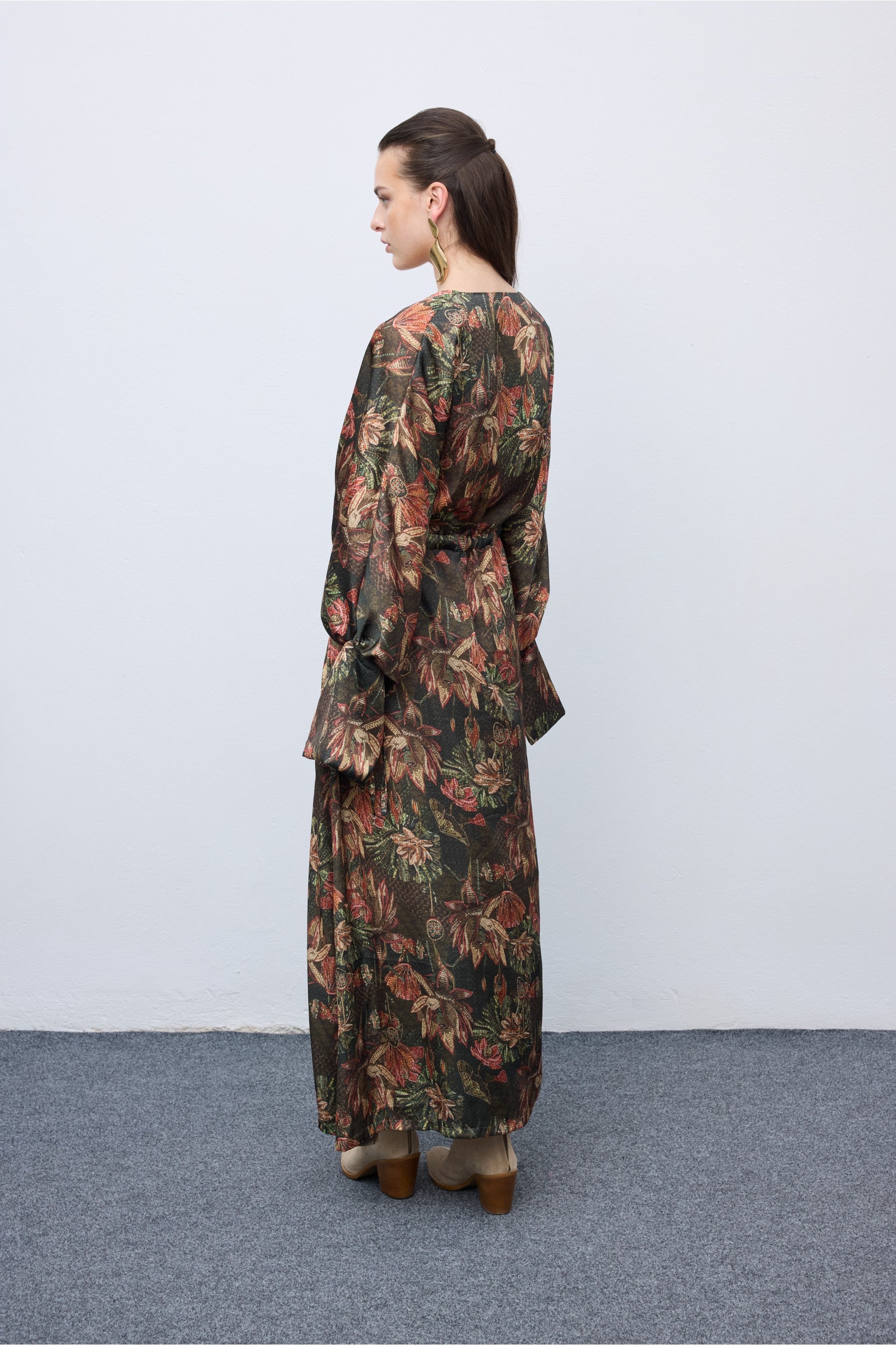 Step into effortless elegance with the Mosaic Oasis midi dress, featuring a unique mosaic-inspired leaf print. Crafted from soft , flowing satin , this dress showcases a flattering cross over neckline and an included belt that ties in a flattering wrap-over style. With its flowing silhouette and refined design, this dress is perfect for both daytime and evening occasions.