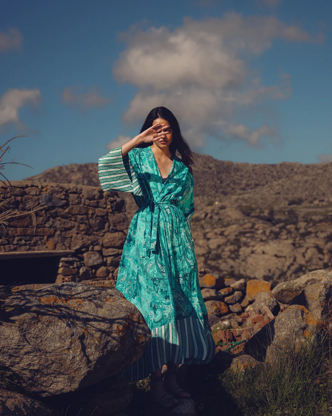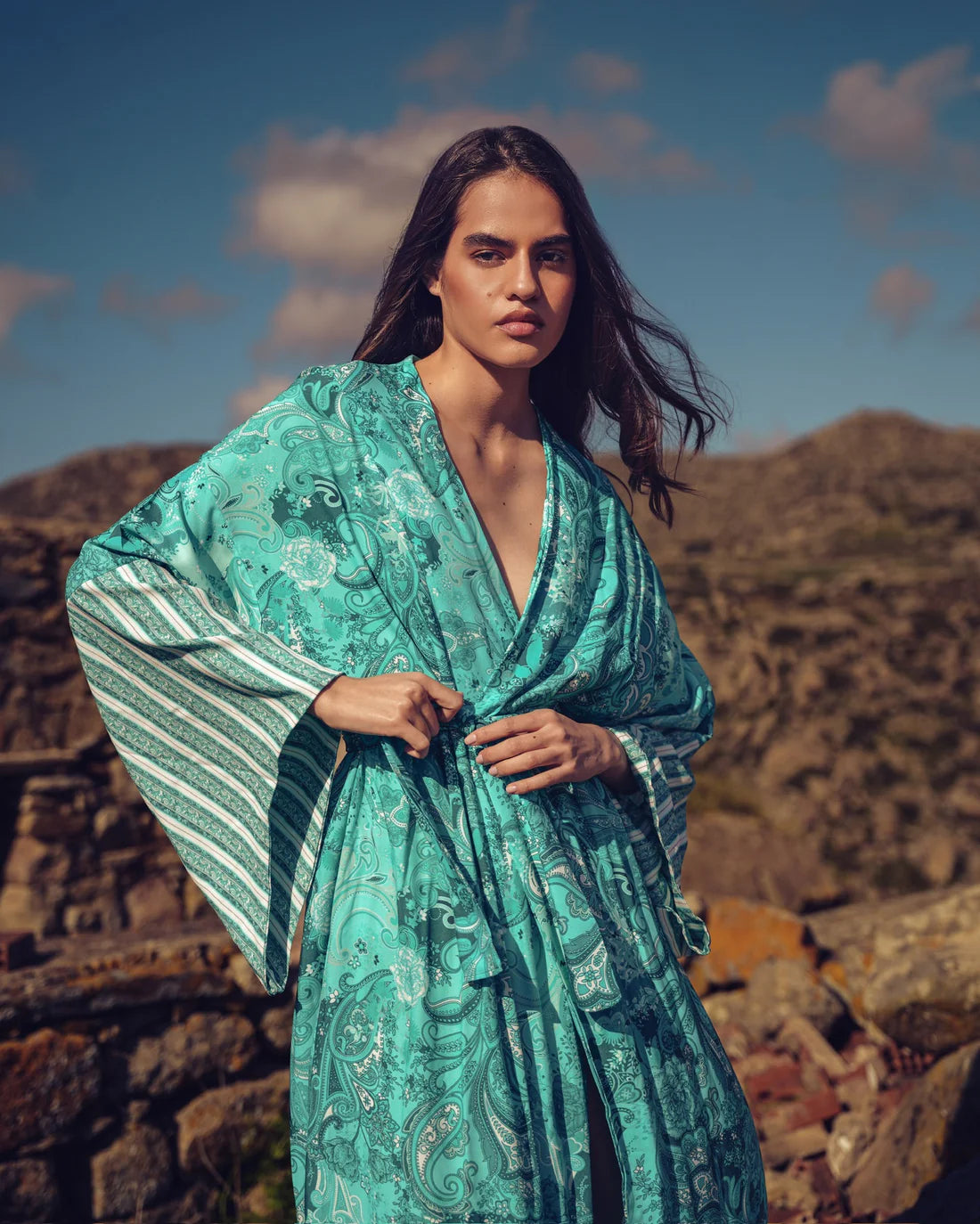 Αυτό το κιμονό είναι μια κομψή και εντυπωσιακή δημιουργία με μποέμικη αύρα και έντονα ανατολίτικα στοιχεία. Είναι μακρύ σε μήκος, αγκαλιάζει το σώμα με ζώνη στη μέση που τονίζει τη σιλουέτα, ενώ τα πολύ φαρδιά μανίκια τύπου καμπάνα ενισχύουν τη θεατρικότητα και την αίσθηση πολυτέλειας του ρούχου. Κατασκευασμένο απο 100% βαμβακερή βισκόζη, έιναι αέρινο και ελαφρύ, με εντυπωσιακό print σε ζωηρές αποχρώσεις τυρκουάζ συνδυασμένα σε φλοράλ και paisley μοτίβα. Το τελείωμα στο κάτω μέρος και στα μανίκια διακοσμείται με ρίγες και βοτανικά σχέδια σε αντίθεση με το υπόλοιπο σχέδιο, προσθέτοντας μια ιδιαίτερη σχεδιαστική πινελιά.