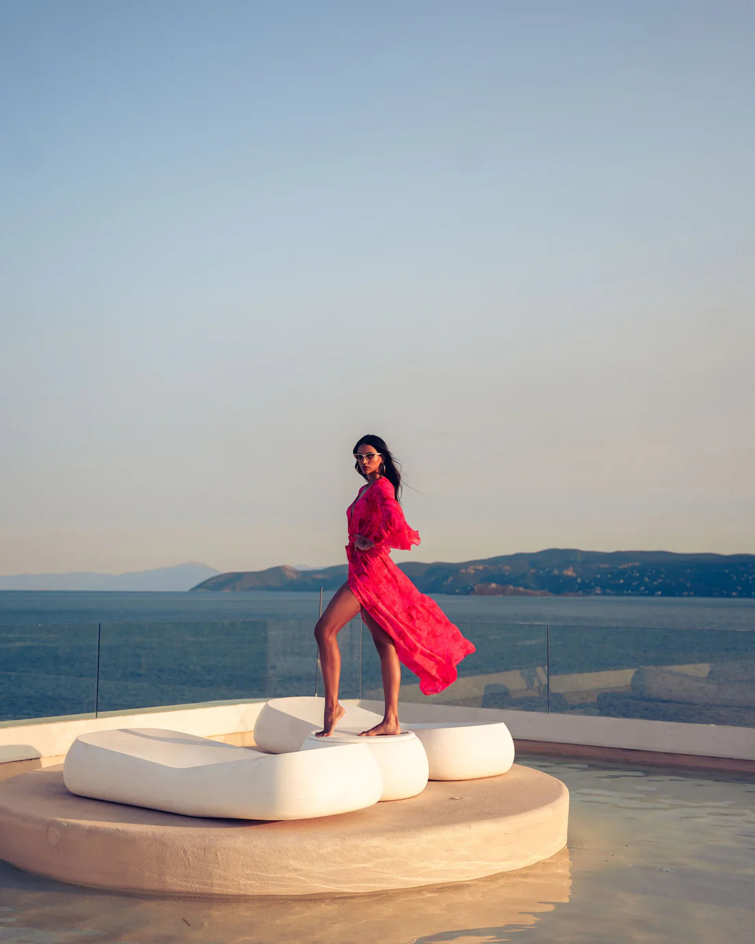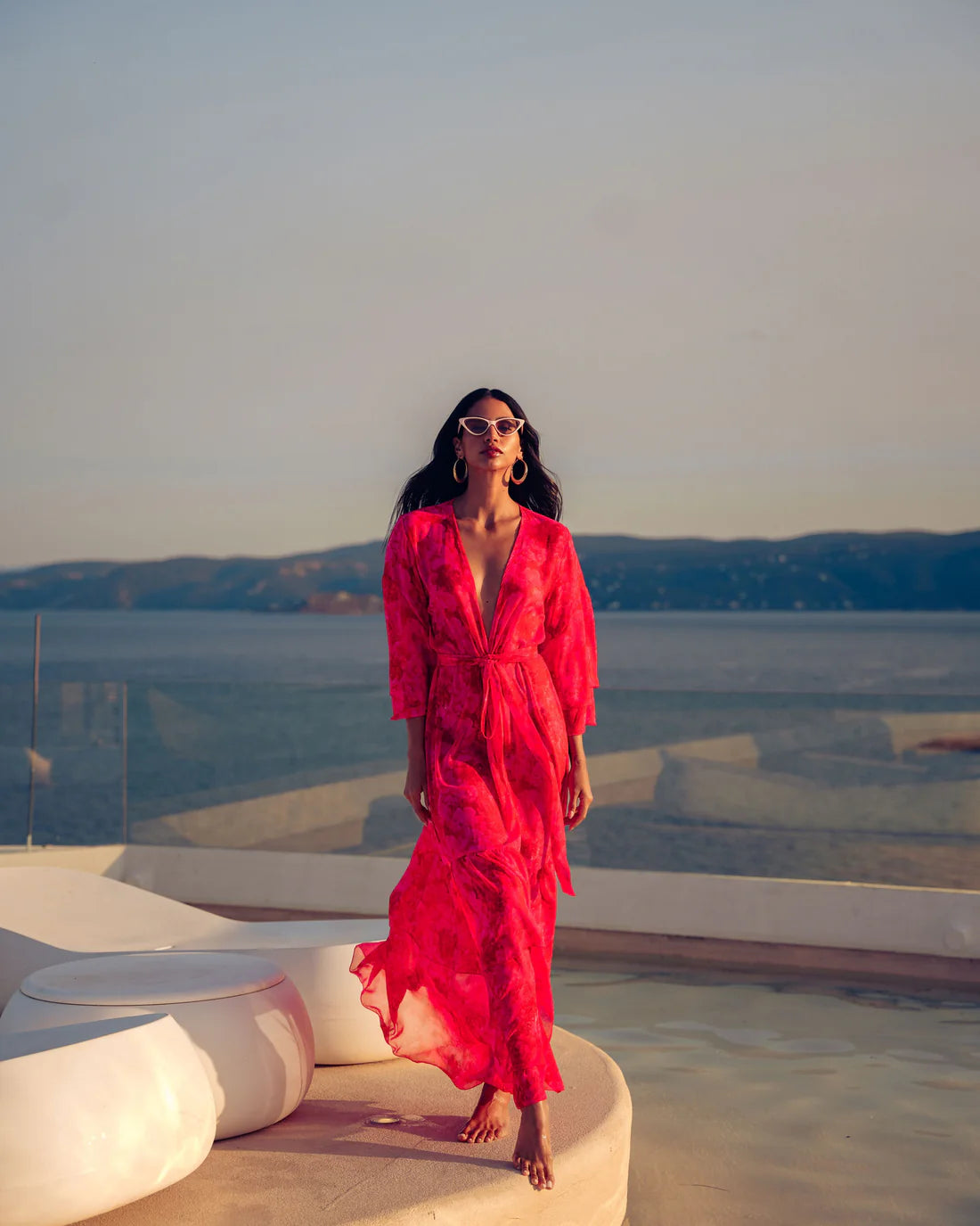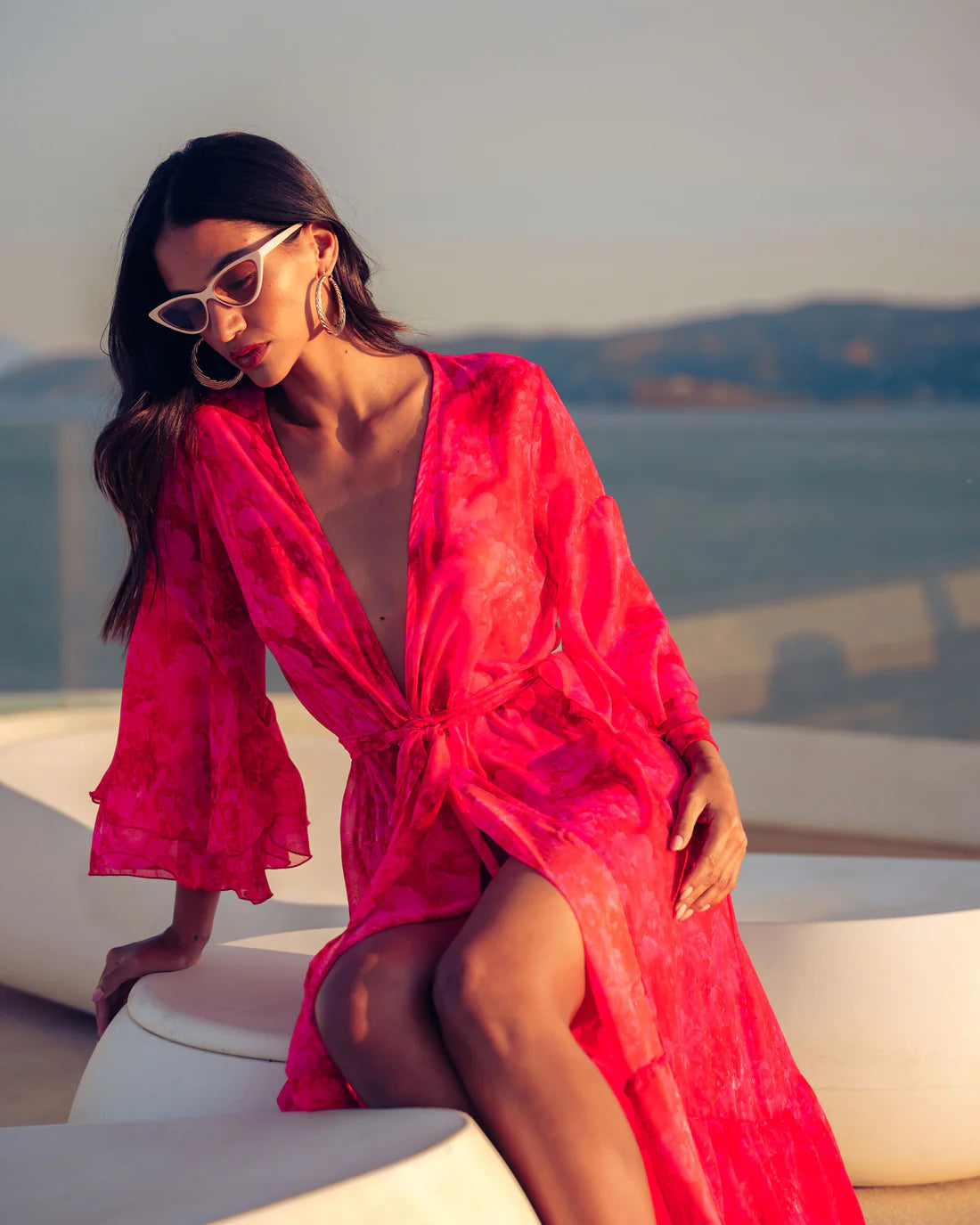 Αυτό το εντυπωσιακό κρουαζέ κιμονό φόρεμα ξεχωρίζει για τη ρομαντική και αέρινη αισθητική του. Είναι maxi σε μήκος και διαθέτει υπέροχο φλοράλ μοτίβο σε έντονο φούξια. Είναι πολυμορφικό και μπορεί να φορεθεί με πολλούς, διαφορετικούς τρόπους. Το σχέδιο του είναι κρουαζέ, αγκαλιάζοντας τη σιλουέτα με ζώνη στη μέση, δημιουργώντας μια κομψή και θηλυκή γραμμή.