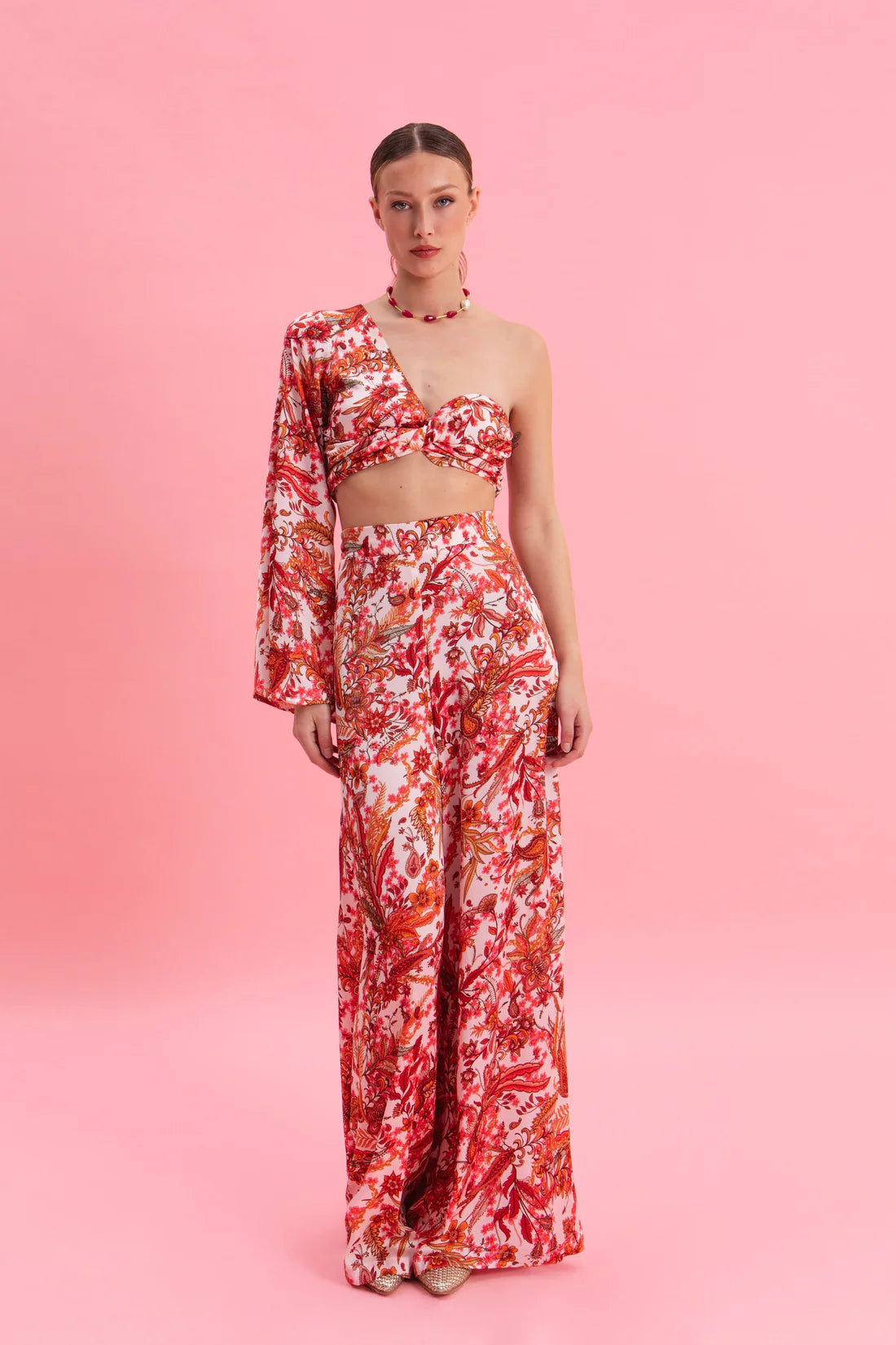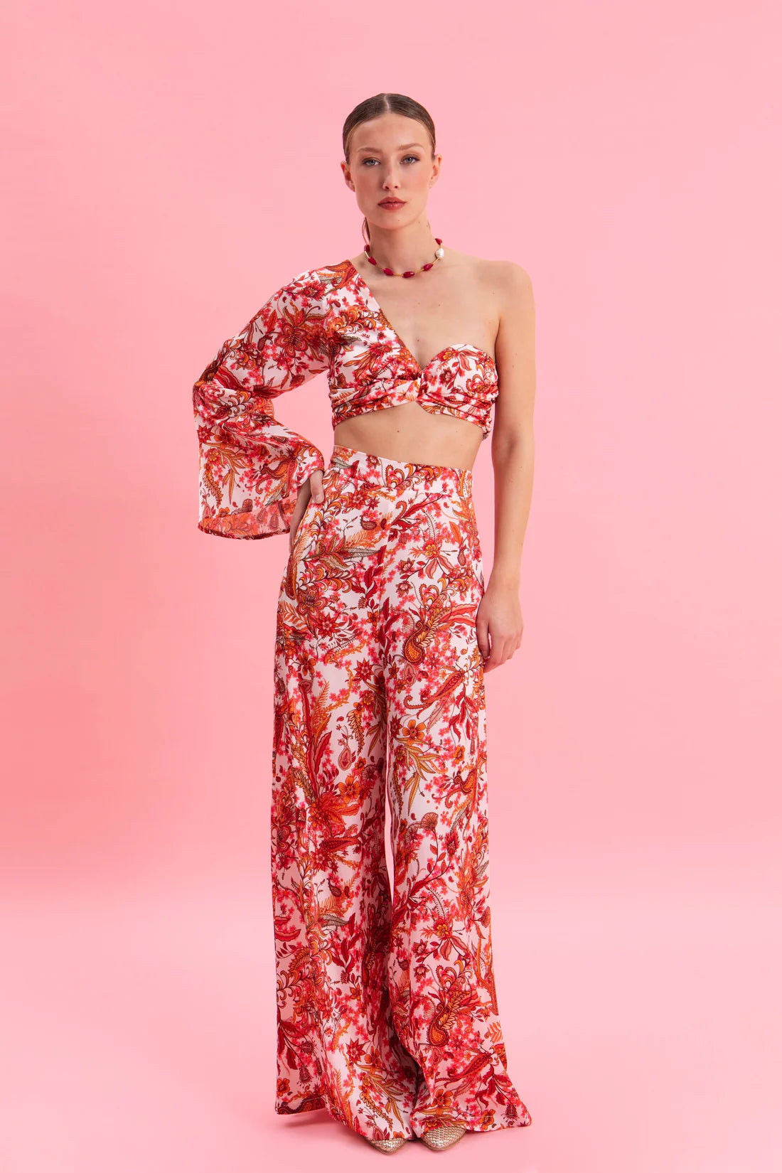 Αυτό το τοπ είναι ένα τολμηρό και fashion-forward κομμάτι, που ξεχωρίζει για τον μοναδικό του σχεδιασμό και την έντονη, χαρούμενη αισθητική. Πρόκειται για ένα ασύμμετρο crop top με έναν ώμο. Η αριστερή πλευρά διαθέτει μακρύ μανίκι με ελαφριά καμπάνα στο τελείωμα, που δίνει μια δραματική και ρομαντική αίσθηση ενώ η δεξιά πλευρά είναι strapless, με στητό σχέδιο τύπου bustier που αγκαλιάζει το στήθος. Διαθέτει κόψιμο κάτω από το στήθος, που δημιουργεί ένα κομψό twist στο μπροστινό μέρος και σφηκοφωλιά στο πίσω μέρος για άριστη στήριξη και εφαρμογή. Κατασκευασμένο απο ανάλαφρο, σατινέ ύφασμα με διακριτική γυαλάδα, που δίνει πολυτελή αίσθηση, με έντονα λουλούδια και λαχούρια σε αποχρώσεις του κόκκινου, πορτοκαλί, φούξια και κεραμιδί, πάνω σε λευκή βάση. Ιδανικό για καλοκαιρινές εξόδους, beach parties ή ειδικές περιστάσεις όπως γάμους και βαφτίσεις. Μπορεί να συνδυαστεί με το Rustic Romance satin pants για ένα τέλειο, elegant look.