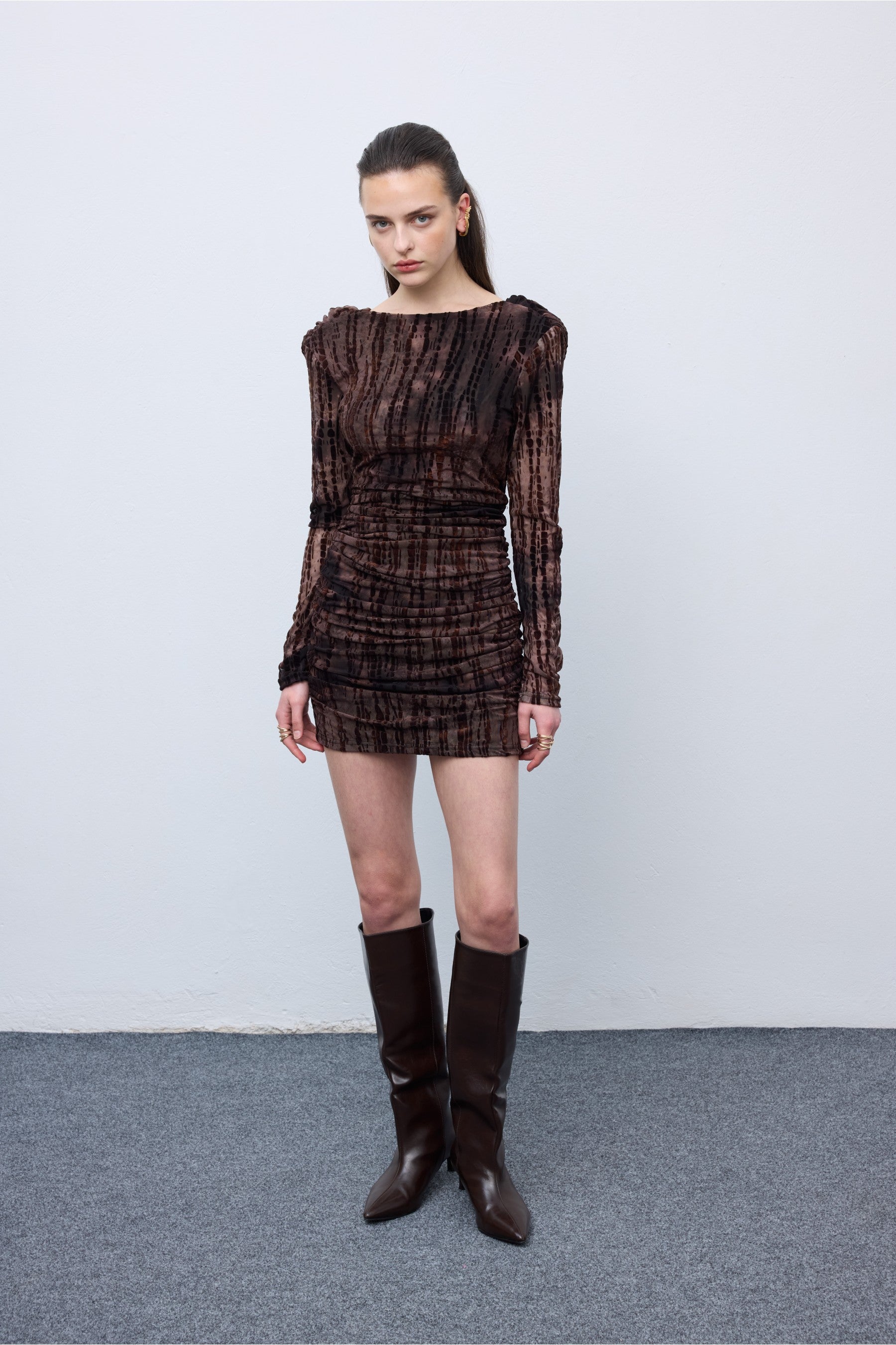 The Second Skin Mesh Dress is a body-hugging piece that perfectly combines elegance and edge. Crafted from soft, semi-sheer mesh fabric, it features a ruched silhouette that flatters the figure and creates a sculpted look. The dress has long sleeves , a short hemline and a distinctive draped neckline that can be styled off-the shoulder or as cowl neck for a versatile touch. Its rich brown tie-dye pattern adds depth and texture, making it ideal for both day-to-night wear.