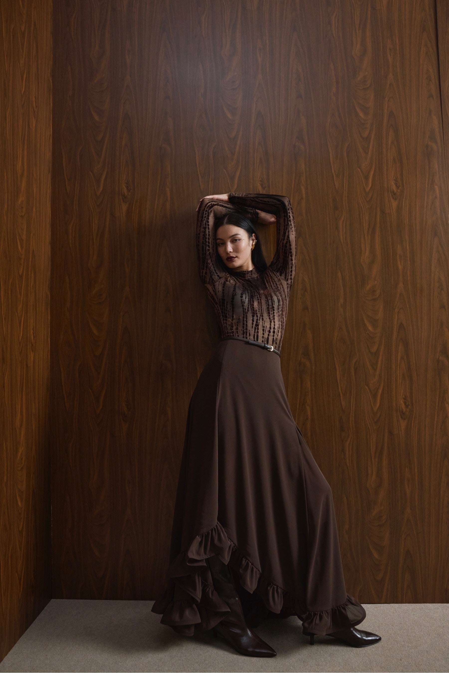 The Second Skin Mesh Top is the perfect fusion of sensuality and sophistication. Crafted from soft, semi-sheer stretch mesh with a unique tie-dye pattern , it contours the body like a second skin . Featuring long sleeves , it's both versatile and timeless. Wear it with the matching maxi skirt for a complete look, or style it with jeans or tailored trousers for a modern edge.
