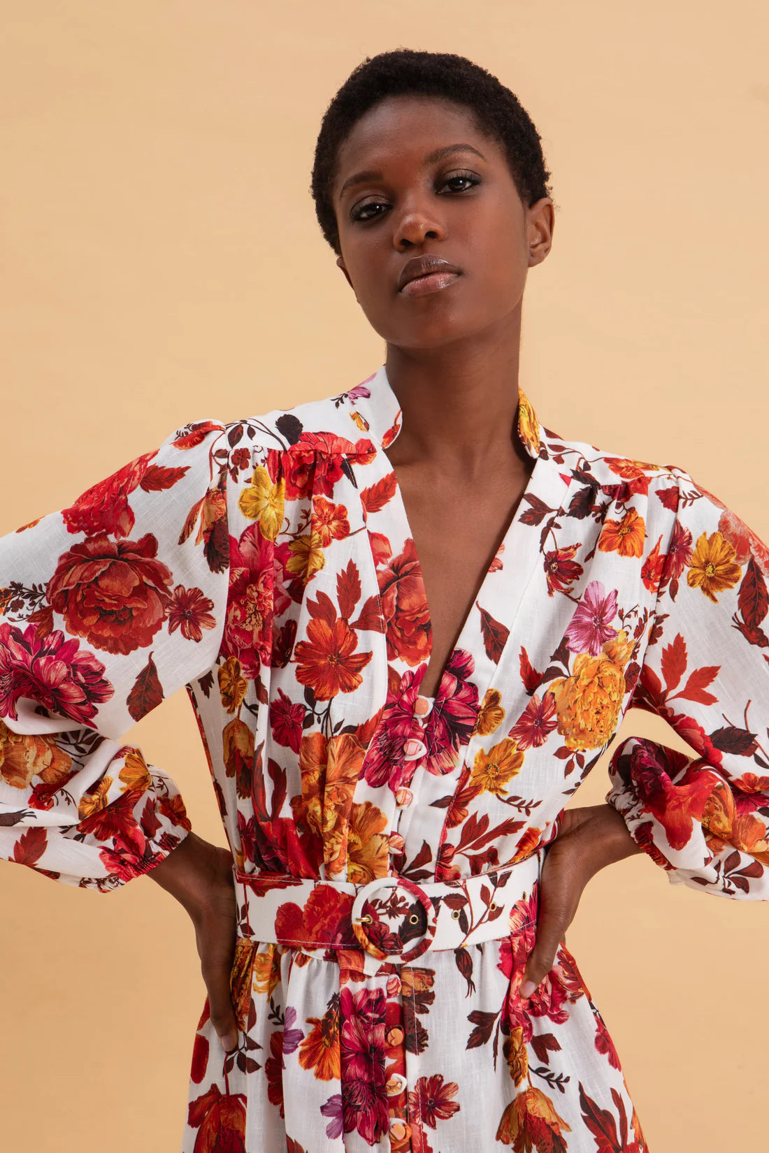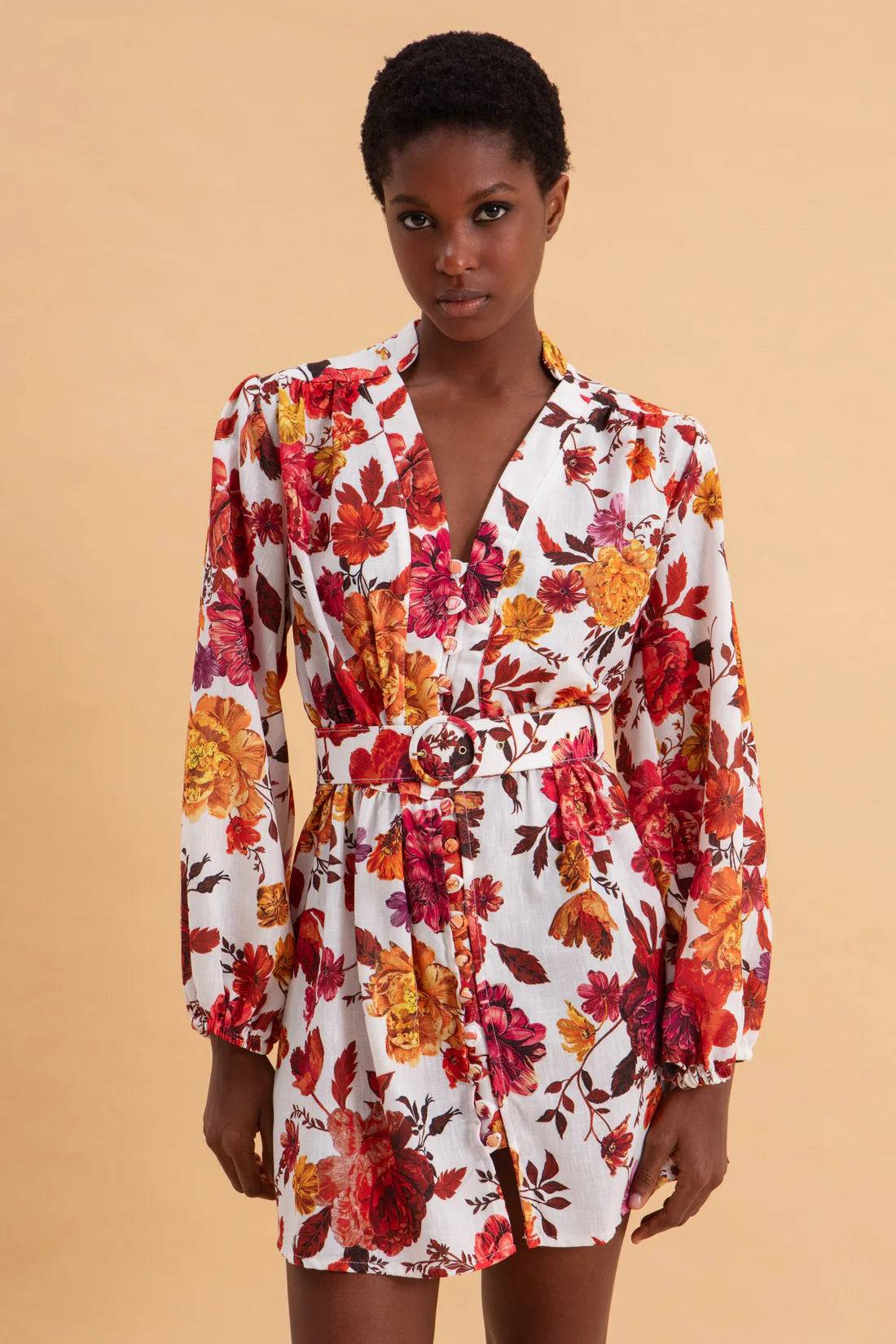 SPRING BOUQUET MINI LINEN DRESS WITH BELT