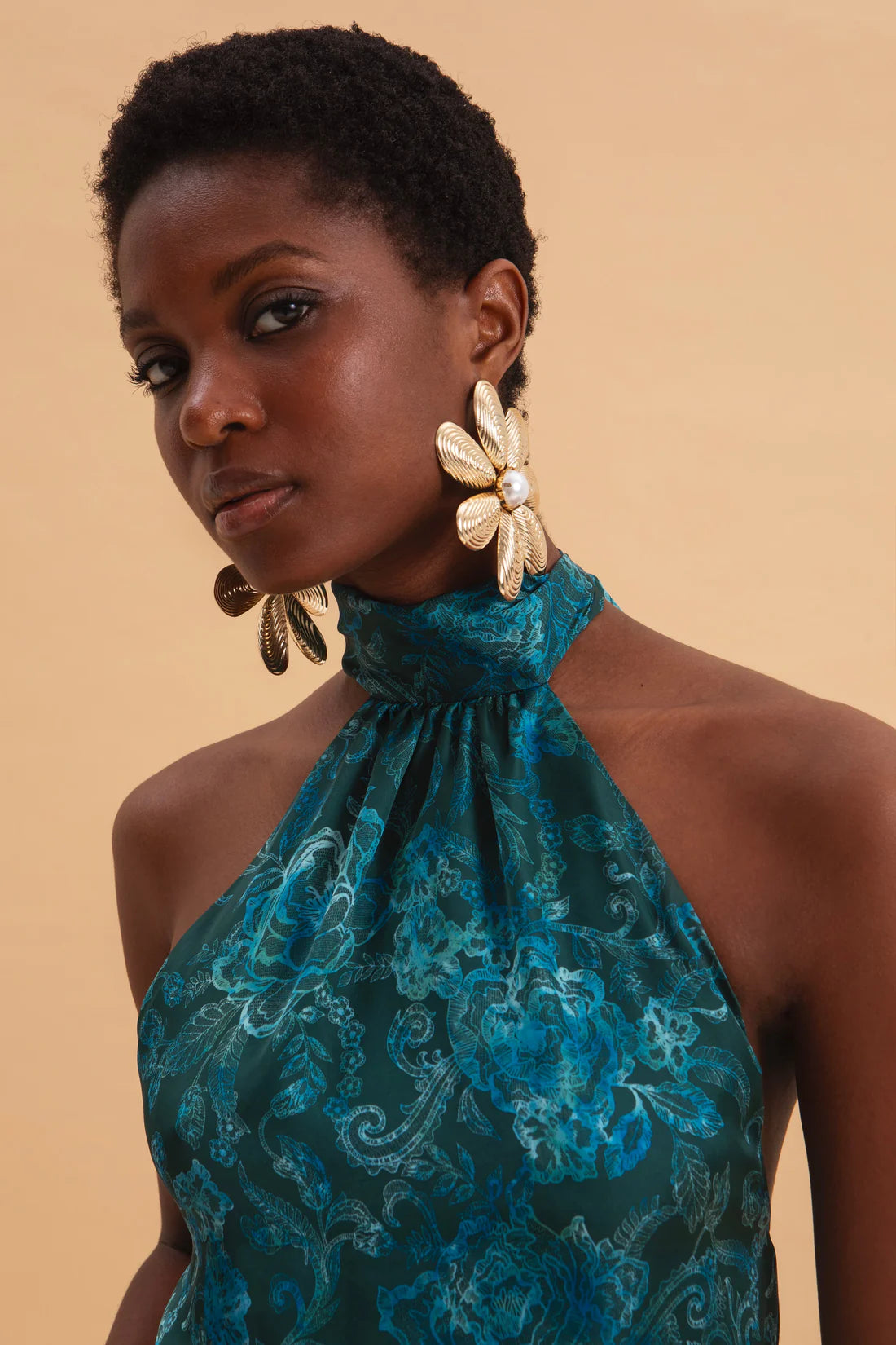 TEAL ELEGANCE MINI SATIN HALTERNECK DRESS